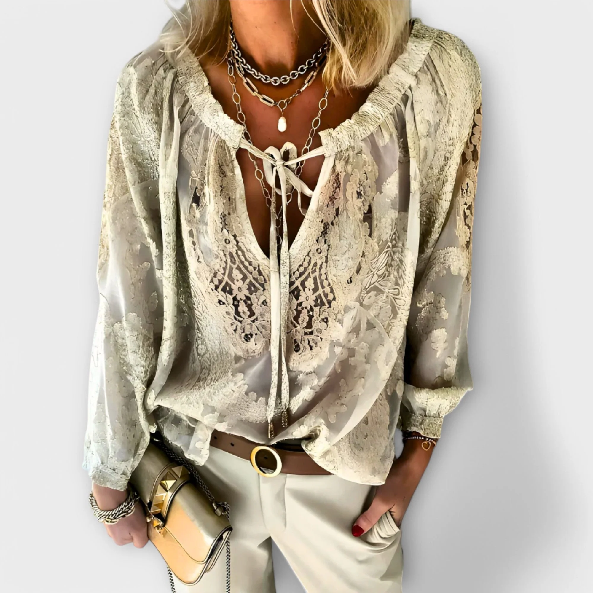 Add a touch of bohemian charm to your wardrobe with this beautifully crafted lace blouse—featuring delicate detailing, an airy silhouette, and a chic tie-neckline for timeless femininity.
